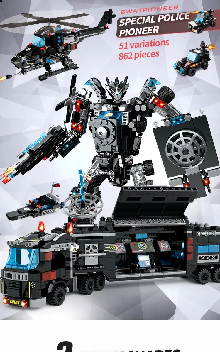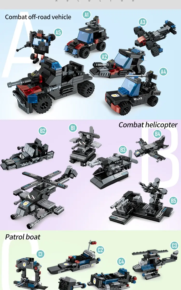 This collection of city police games has 25 cool models. It can make eight different types of vehicles, planes and boats, each in three different forms, enabling children to learn different types of vehicles, planes and boats. You can get a total of 25 Creative City Police toy is a great educational toy that hours of building and playing to stimulate your child's imagination and creativity