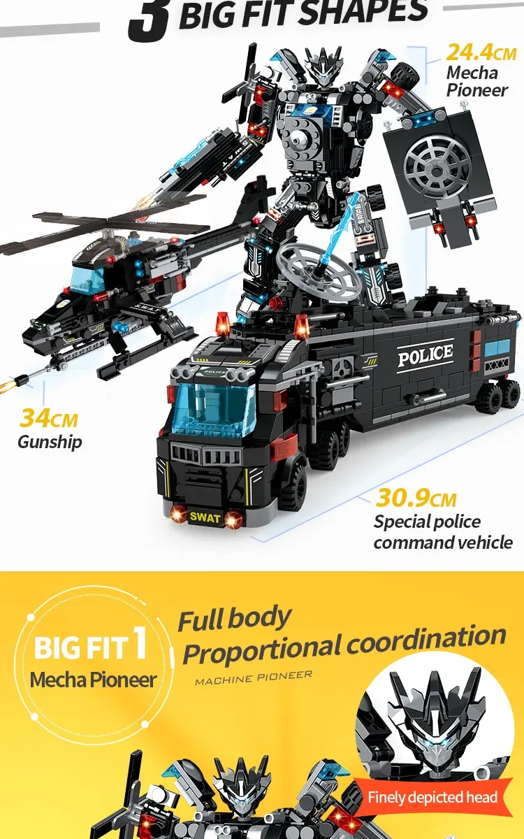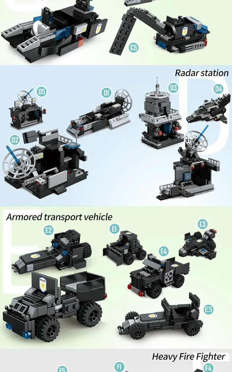 -This is a cool city police series of blocks with 1022 pieces of building bricks, the set contains a mobile command center truck and police headquarters, seaplane, patrol boat, police car, prison van, armored vehicle, helicopter, police station, police post, etc.